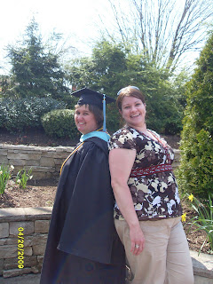 As the hour marched on before we marched down the steps and to our seats, I found out that I was going to be wearing to sets of honors cords. One set was the purple and green for Kappa Delta Phi for the Education division and then I received gold cords for being Cum Laude in Education with a GPA of 3.66. YEAH! Needless to say I was shocked to receive the gold ones, I already had the others at home. The ceremony came, we marched through the line of professors, passed the parents and families and friends, and to out seats. The commencement speaker was awesome...15 minutes...he said it was all about your attitude and how you go about making your attitude a positive one and taking on the world with your positive attitude. Next came the calling of names and the individual schools that were graduating. First were the Dr. degrees and then the Masters and then finally the Undergrads. Names were called and honors announced and...well at 3:30 I was an official Graduate of Walsh University.